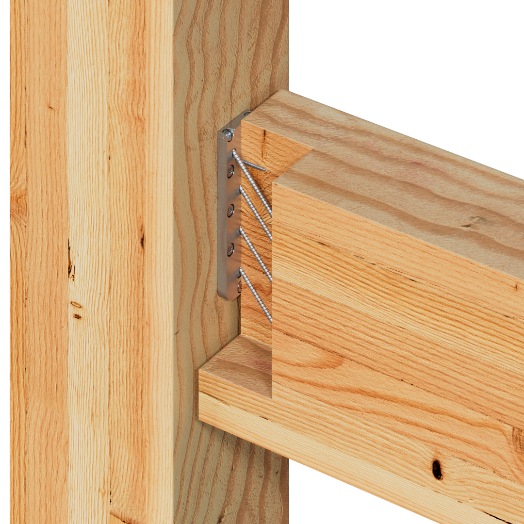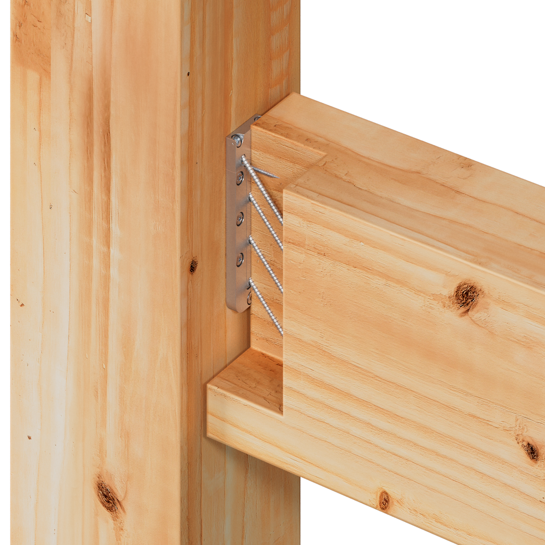 To prevent rotation and to absorb uplifting, lateral and axial loads, two optional fully threaded screws are inserted from the joist through the connector into the header.