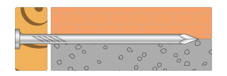 Hartowane gwoździe ze stali wysokowęglowej do mocowania elementów drewnianych do twardych powierzchni, takich jak bet czy elementy murowe.