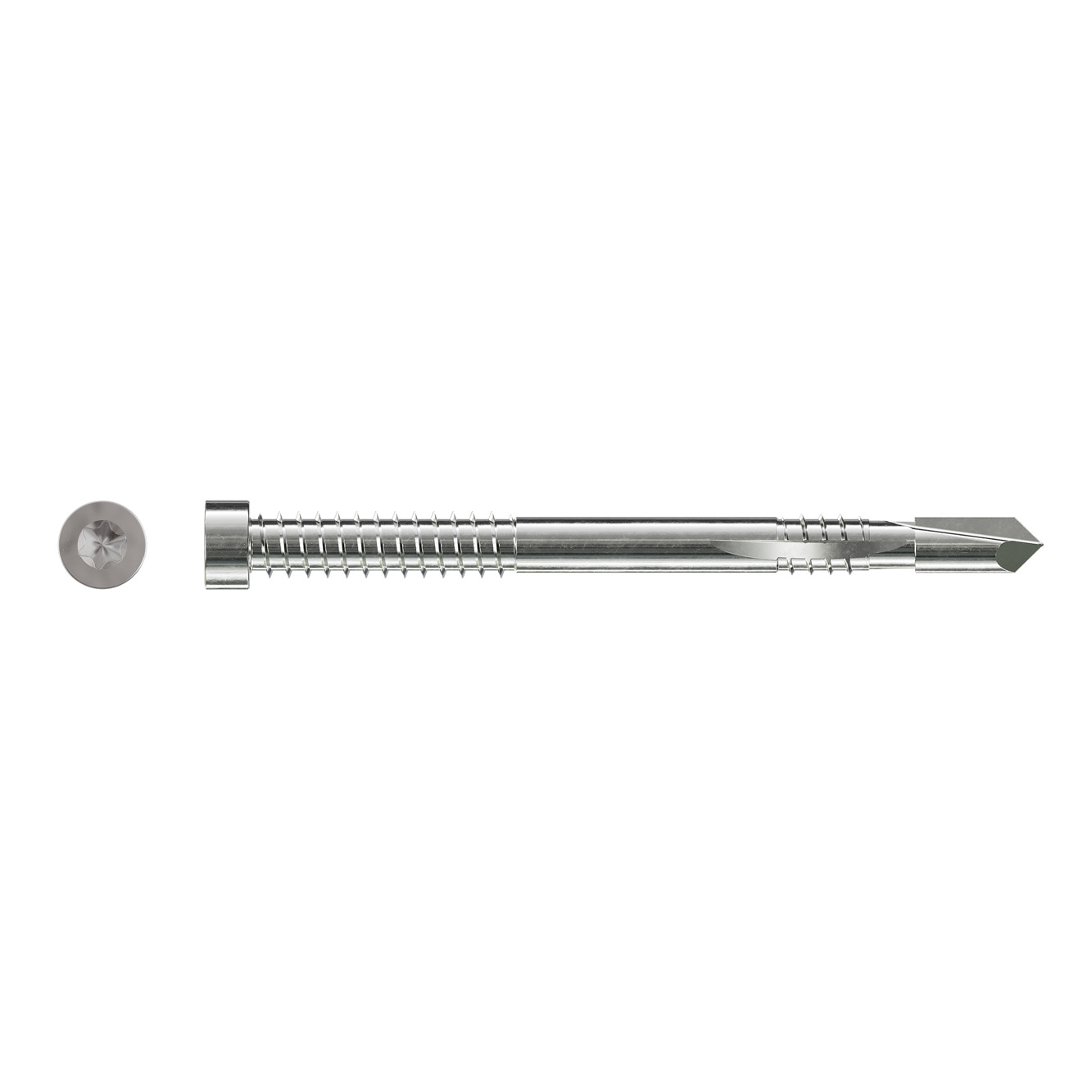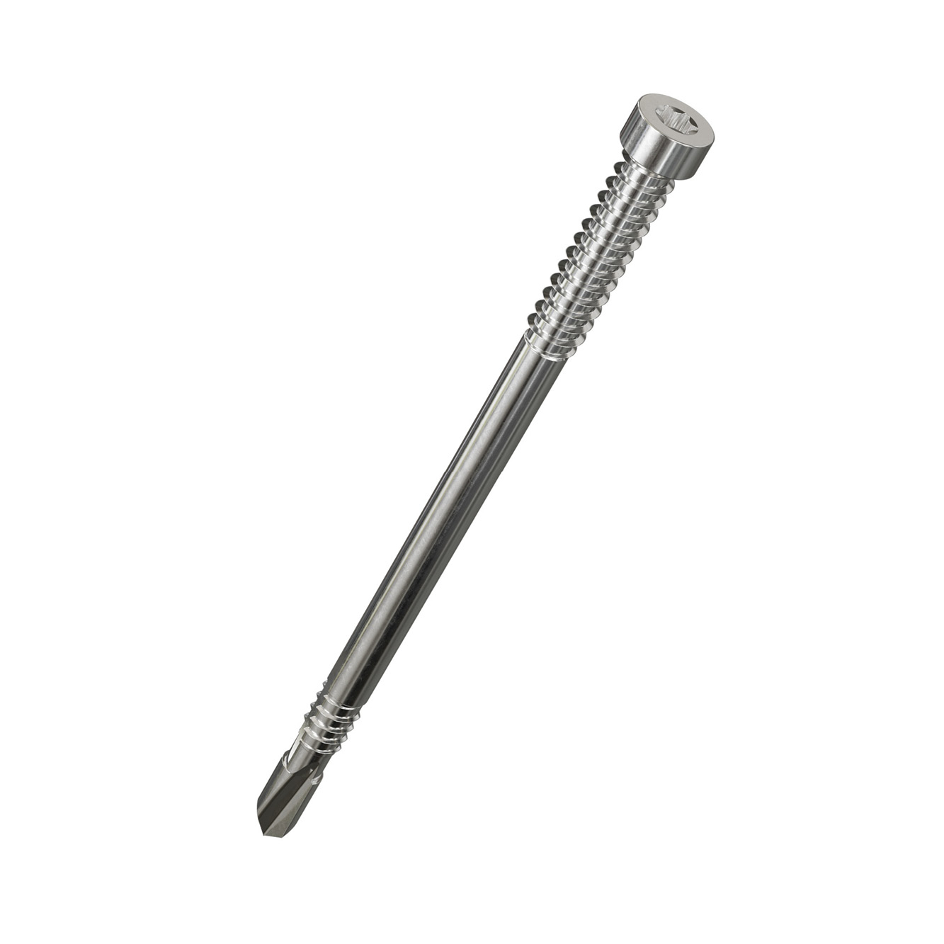 Sworzeń z podwójnym gwintem posiada cylindryczny łeb z głębokim 6-zwojowym napędem T-40, a unikalna konstrukcja wiertła redukuje rozszczepianie drewna. Rowek w dolnym gwincie umożliwia usuwanie wiórów podczas montażu.