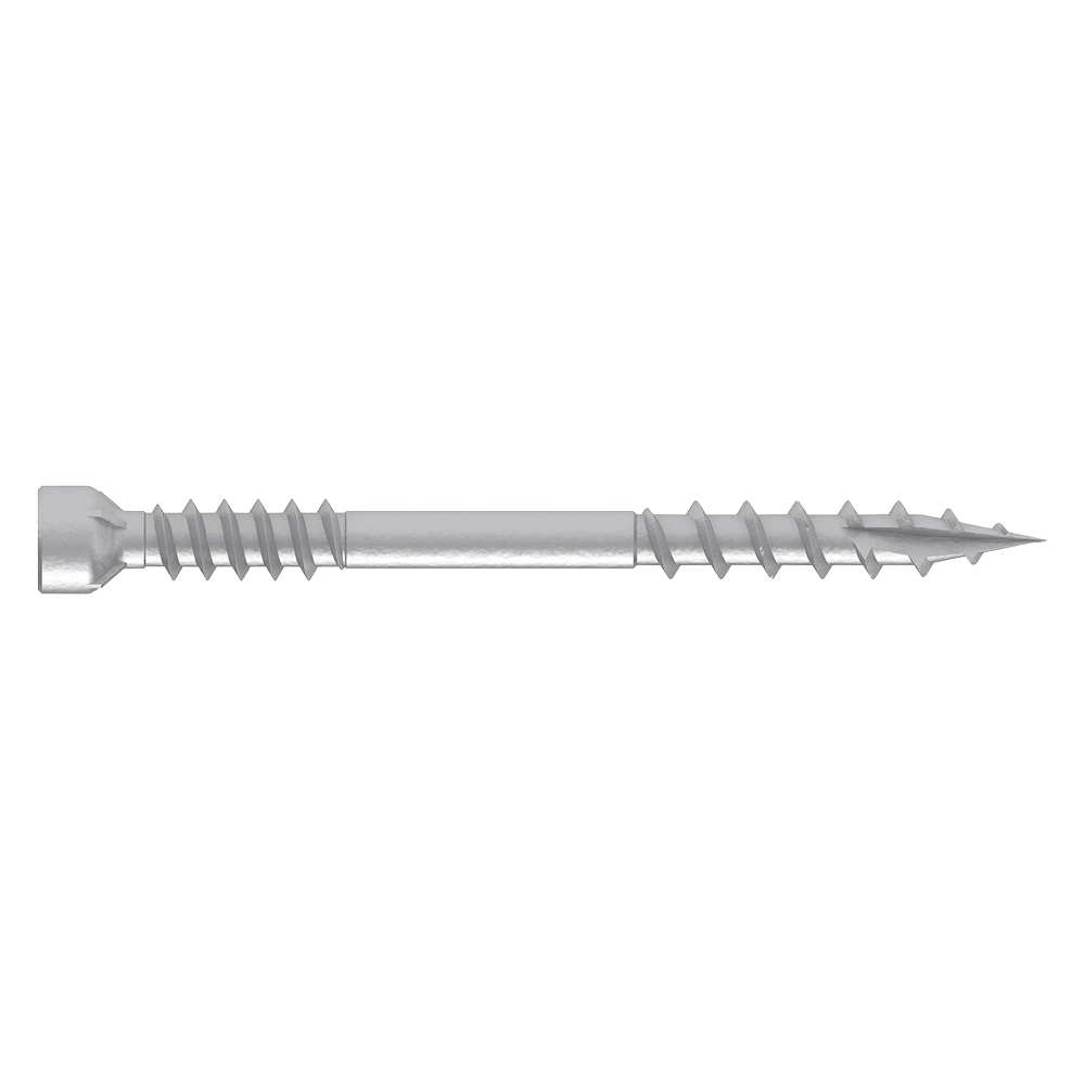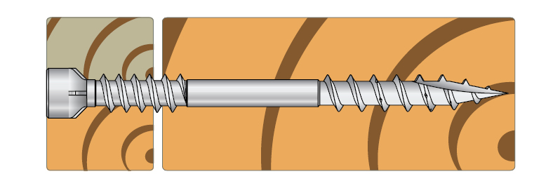 Wkręty tarasowe z małą cylindryczną główką zapewniają estetyczne połączenie deski tarasowej z legarem. Wkręt uzyskuje wysoka wydajność dzięki nacięciu ostrza, które eliminuje rozwarstwianie się drewna a żebra tnące w dolnej części główki wkręta ułatwiają właściwe zagłębienie wkręta równo z powierzchnia materiału. Górny gwint pod głowką wkręta pozwala dociągnąć deskę tarasową do legara i zmniejszyć skrzypienie konstrukcji.