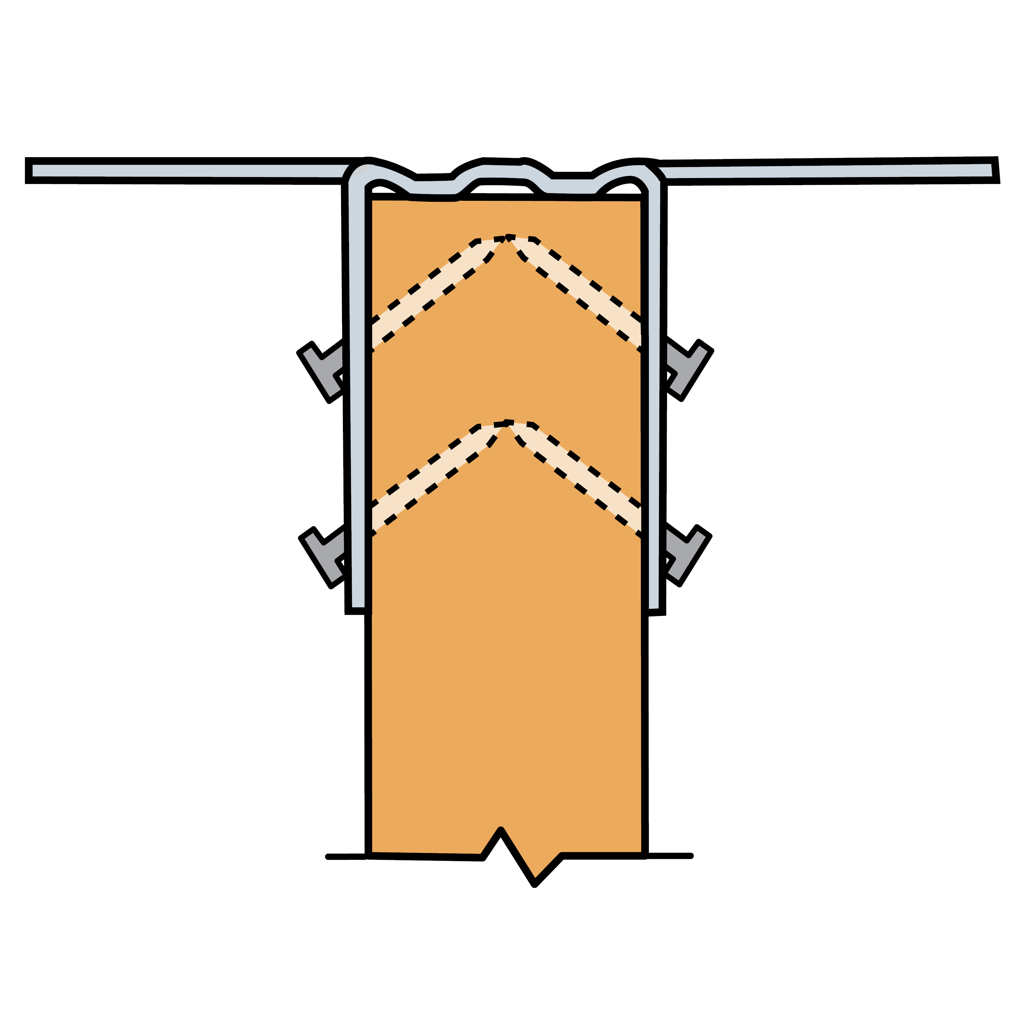 - Wsuń belkę dwuteową, aby luźno oparł się na podstawie i za pomocą gwoździ N3.75x35 przymocuj belkę do wieszaka wypełniając wszystkie otwory.