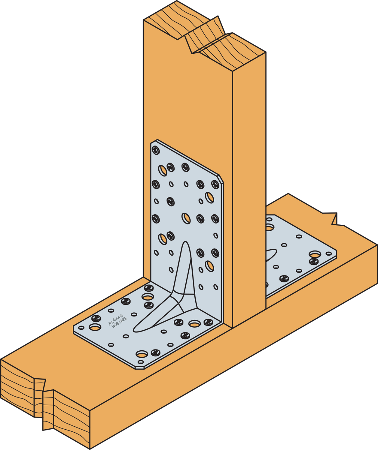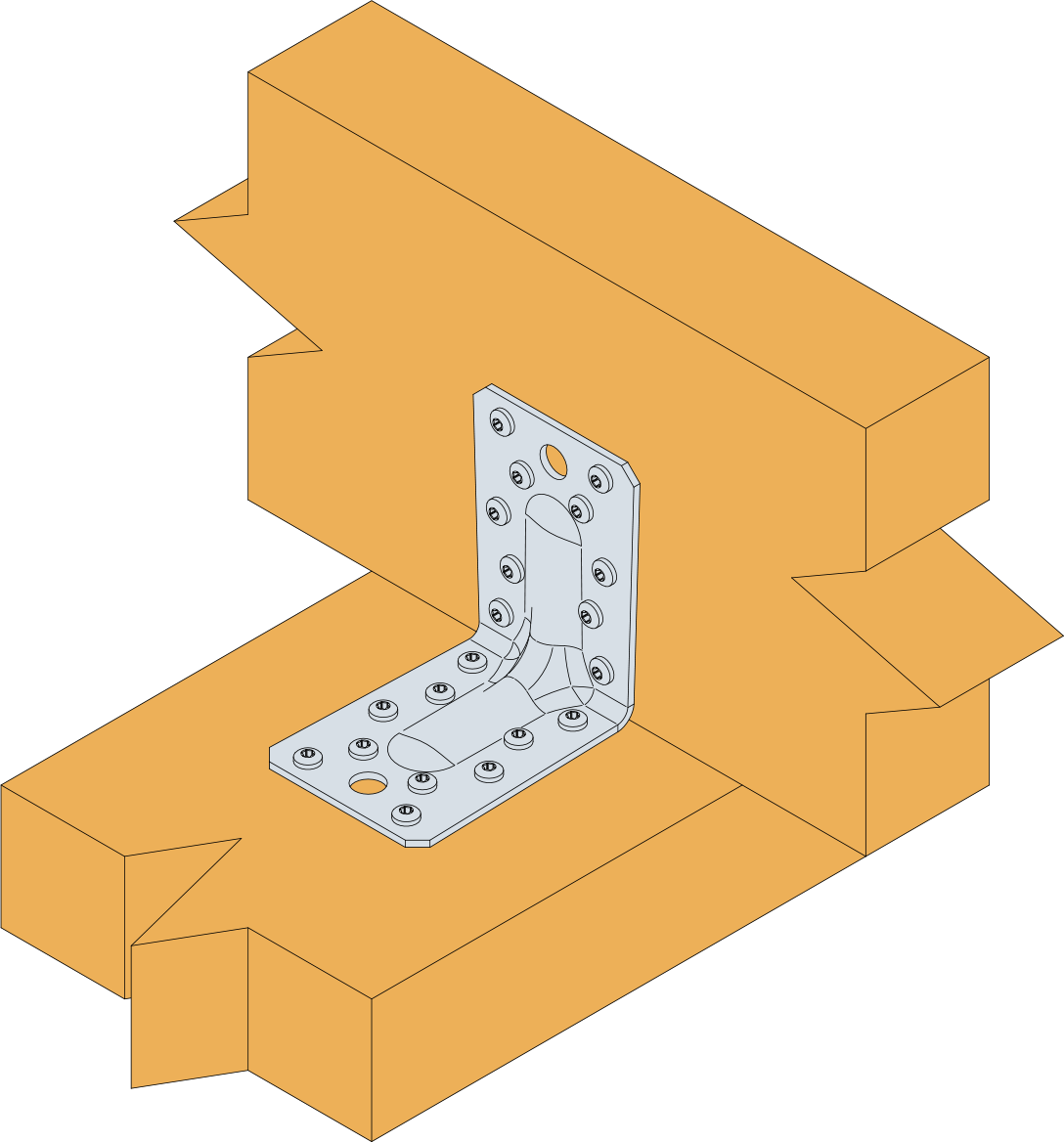 Złącze kątowe wzmocnione nierównoramienne E9S należy do grupy złączy kątowych wzmocnionych pozwalających przenieść większość kombinacji obciążeń w typowych konstrukcjach drewnianych. Dzięki większym gabarytom i różnej perforacji (także otwory na śruby i kotwy) zastosowanie tych kątowników jest bardzo szerokie.